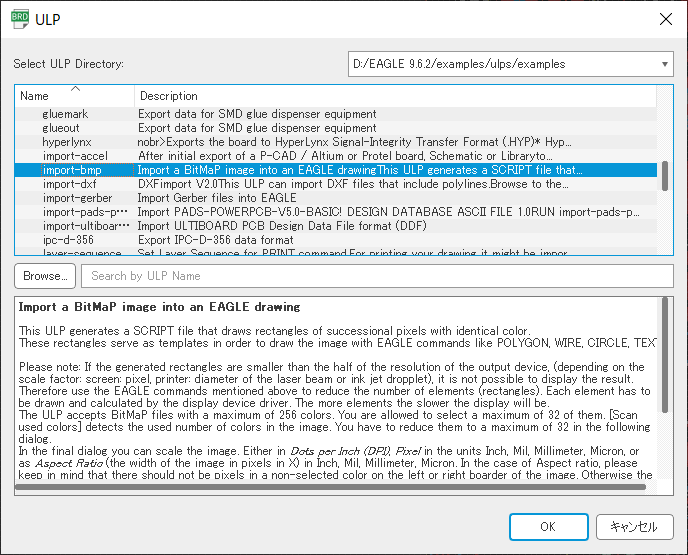 基板のシルクを画像から生成するにはULPのimport-bmpを使います(プリセットで入ってる)