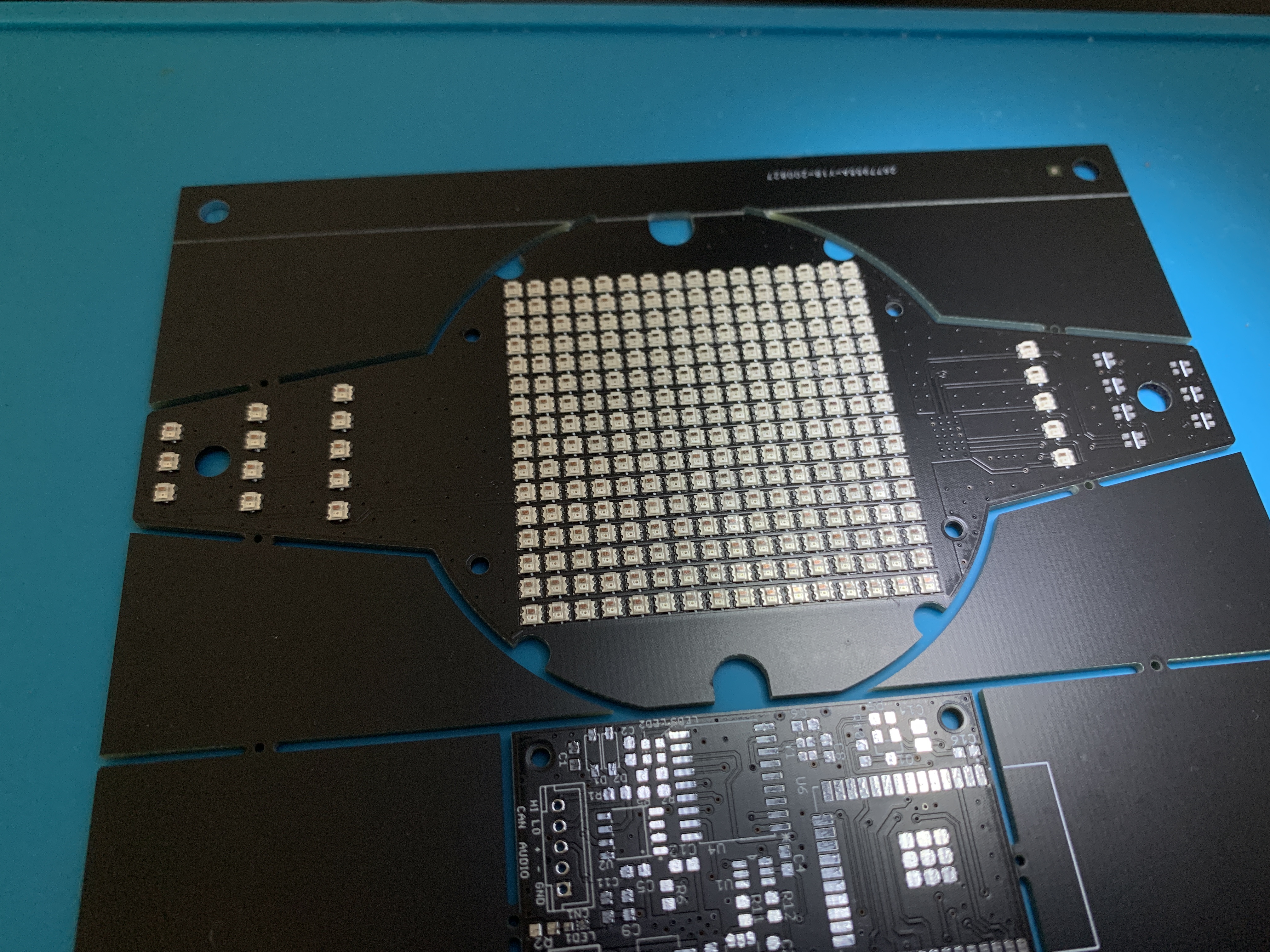 実装するには実体顕微鏡必須です。そして、280個のLEDを実装するので、相当時間がかかります。写真はLEDマトリクスを置き終えた達成感から撮影したものですが、置くだけで1時間以上かかりました。修行です笑