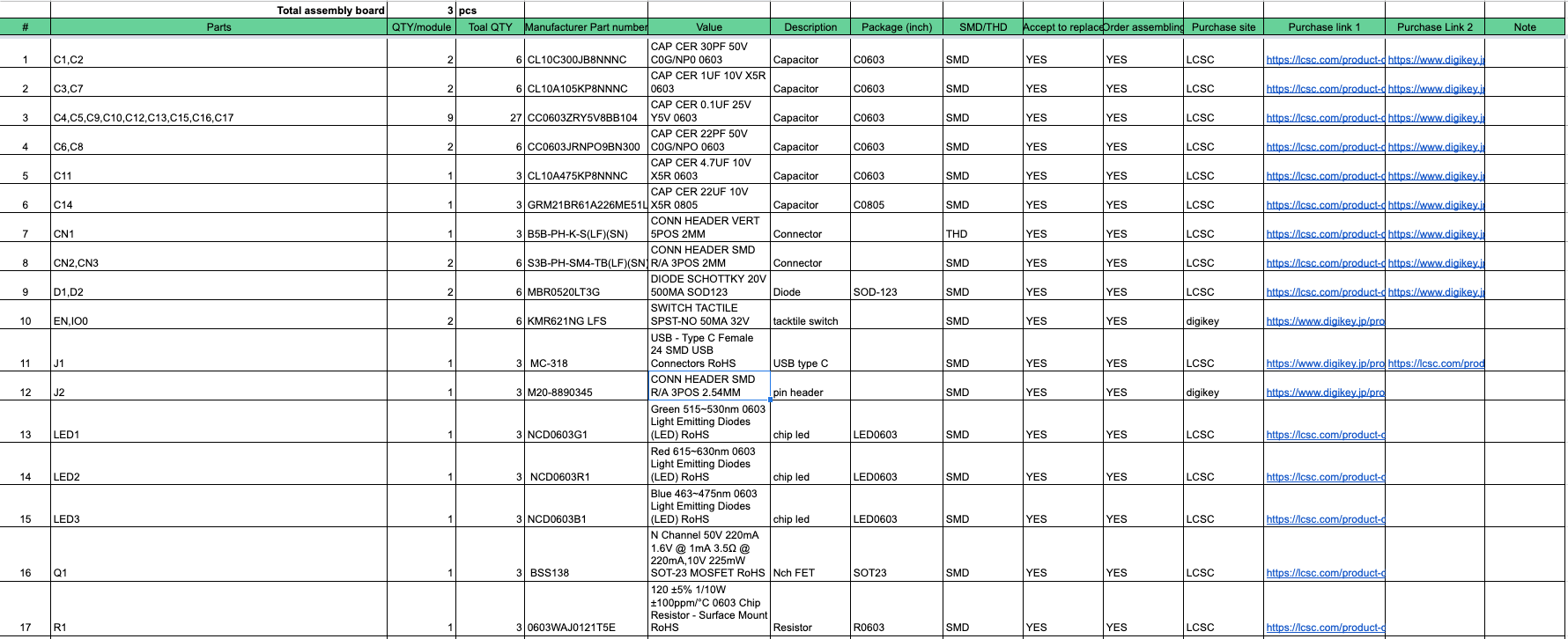 部品番号やスペックだけではなく、どこで売っているか、部品はSMDかTHDか、またコンパチ部品を使用することが可能かどうかも記述しておきます。elecrowはこれを見て、部品を集め、基板の製造〜実装まで行ってくれます。基板の製造だけではなく、面倒な時はPCBAまでお願いするのはアリです。