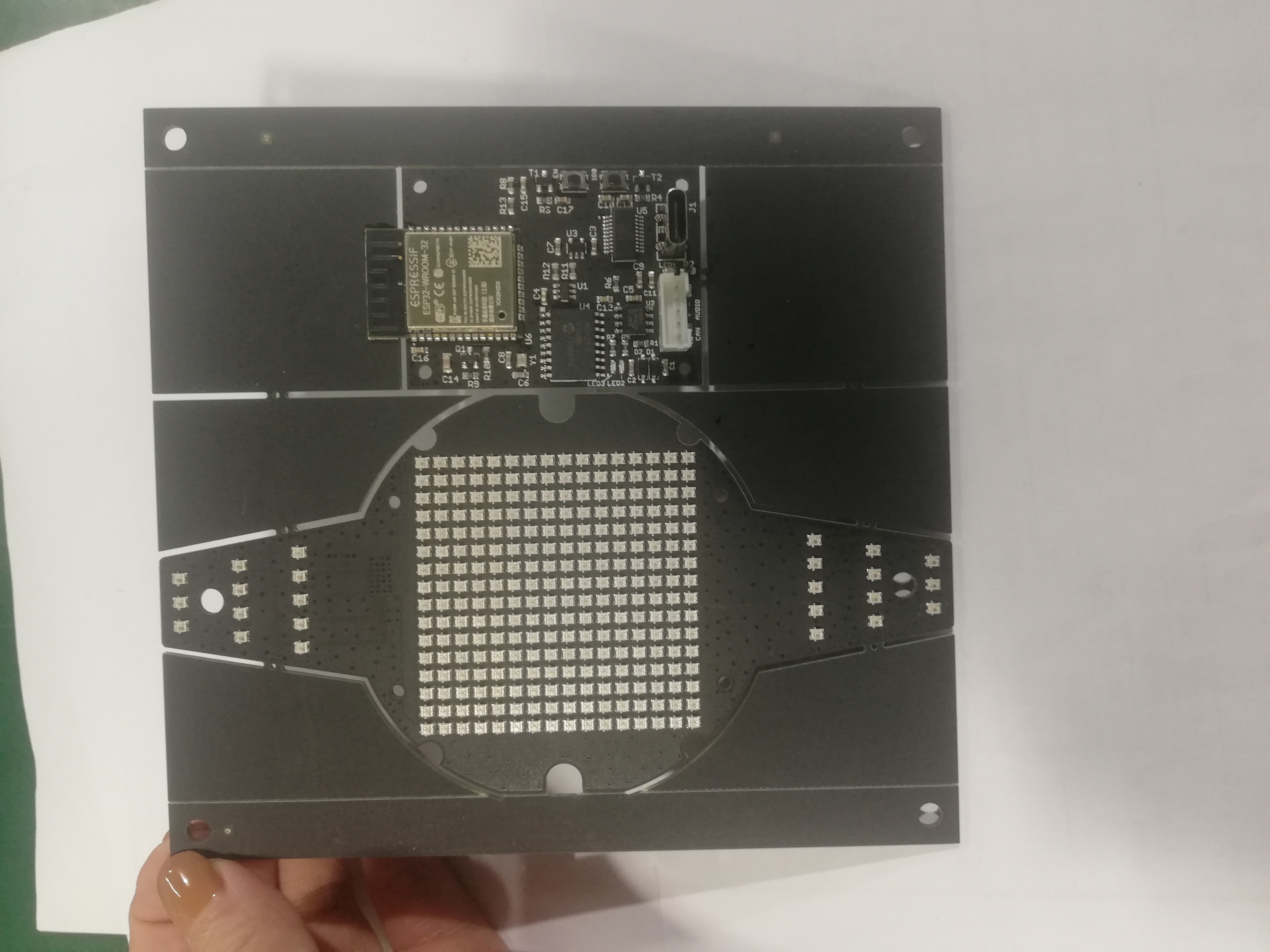 発注したら、出来上がりを待つだけ。PCBAはこんな感じでできてきます。PCBAを作る時は捨て基板をつけるようにしています。これは基板のリフローをする時に捨て基板を利用して固定したり、実装が容易になる、置く向きを間違えないなど製造時にメリットがあるという理由で存在しています。