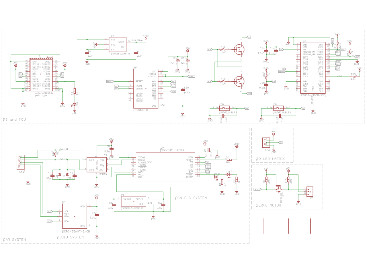 回路図ではシステム構成通りの回路を作っています。電源はUSB type Cでとることにしました。type CですがUSB2として使用する想定だったので、キチンと設計できていません。(反省) 本当はプルダウン抵抗などをつける必要があります。