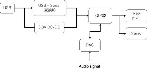 5Vを生かして大量のNeoPixelを動かしたり、サーボを動かしたりすることを考えました。そしてオーディオの信号を入力とし、その信号の振幅によってインジケータLEDを動かすと言う事も考えています。