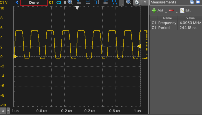 OSCFRQに「0110」を設定すると16MHz駆動にできる。CLKOUTから約4MHzが出るので、これをOSCTUNEで調整した。高精度で測定できる計測器が無いので冒頭のオシロ画面でしか確認できないが、良いとこまで行っているのではないか。