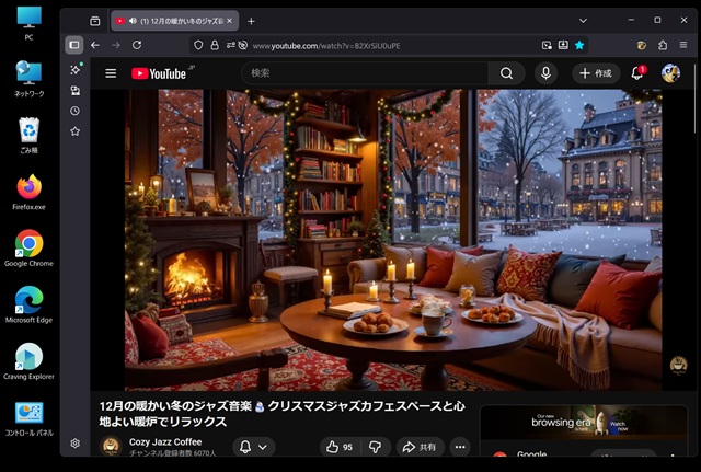 ところが、FirefoxでYouTubeを全画面表示すると、画像と音声が歪むが、Google Chromeでは全画面表示でも正常動作。