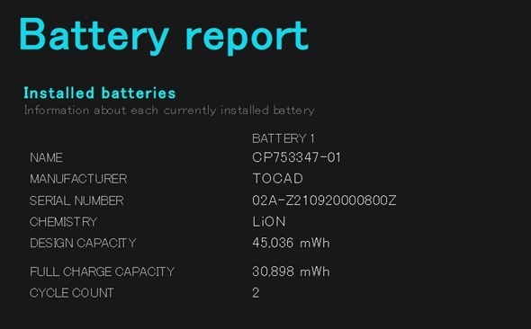 システムディスク C\ に「battery-report.html」 が作成されてるのでブラウザで開く