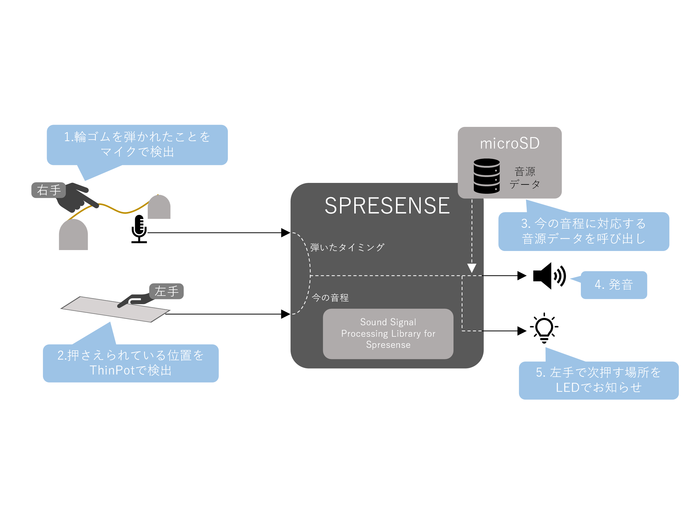 今回のギターのプログラムはソニーの「Sound Signal Processing Library for Spresense」(Spresenseで簡単に楽器を開発するためのライブラリ)を活用しました。