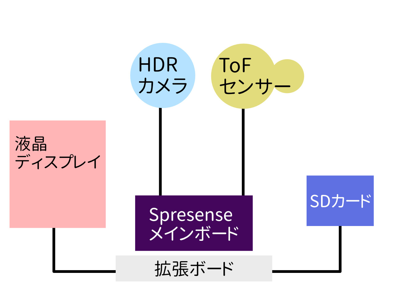 ハードウェアは、Spresenseメインボードを拡張ボードにセット、ToFセンサーとHDRカメラをメインボードに装着、LCDを拡張ボードとケーブルで接続、簡易ケースを作成しました。