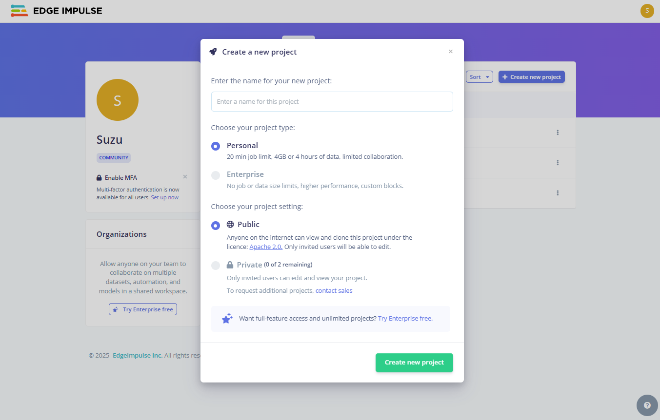 Edge Impulseのプロフィールページから、"Create new project"で新しいプロジェクトを作成します。無料アカウントでは2つまで非公開プロジェクトを作成できます。