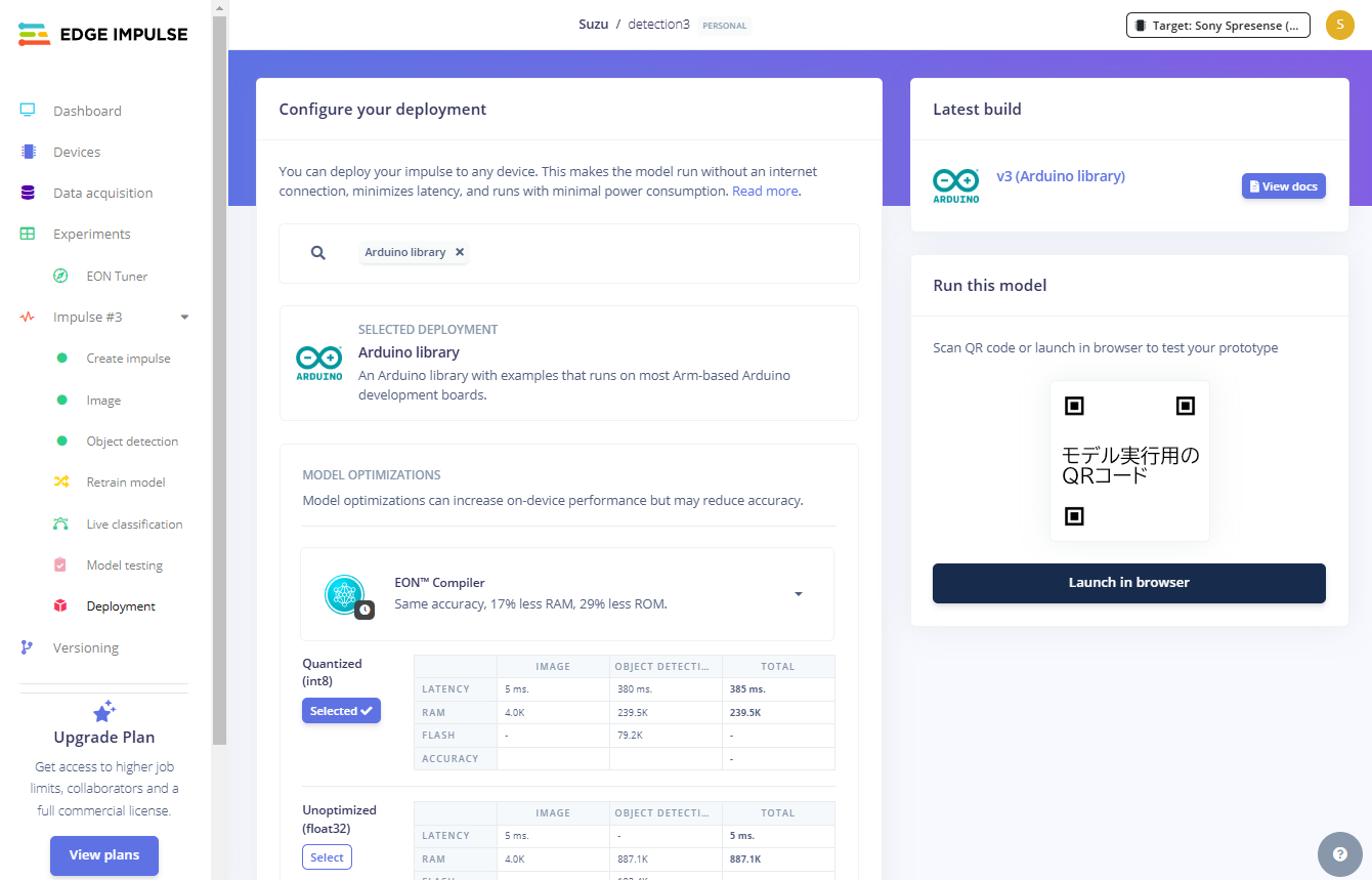 "Deploy"ページからトレーニングしたモデルを、ArduinoライブラリのZIPアーカイブとしてダウンロードします。