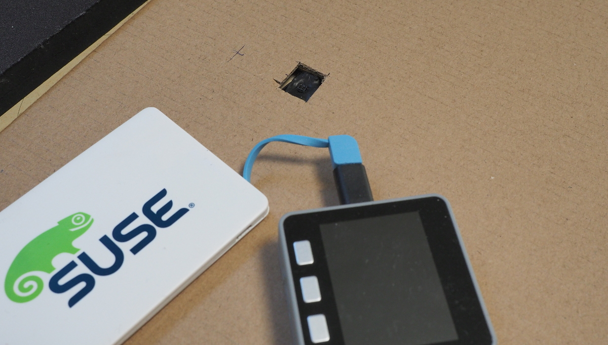 郵便受けの床の部分は段ボールで作りました。真ん中に穴を開けて取り付けます。フォトインタラプタは対象物から多少離れていた方が感度が良いため、床面から少し離したほうが良いです。段ボールの穴のサイズも余裕を持っておかないと、赤外線がフチで反射する可能性があります。