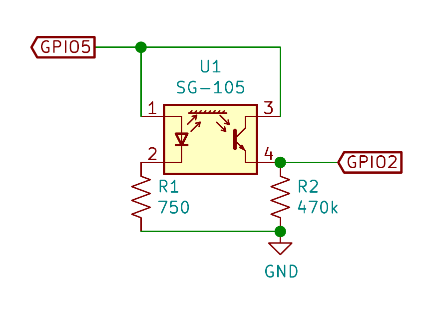 次に、重要なセンサー値の読み取りです。A/D 変換を使ったり、可変抵抗をつければ後から調整することもできるのですが、シンプルに GPIO で取り込むことにしました。そのためには郵便物があるときに、GPIO 2 の電圧がプログラムから読み取ったときに1になる電圧になるように R2 の抵抗値を調整します。反射しにくい濃紺の(某宅配レンタルの)封筒をセンサーの上にかざした状態で、R2 を増やしていった結果、750 kΩ になりました。