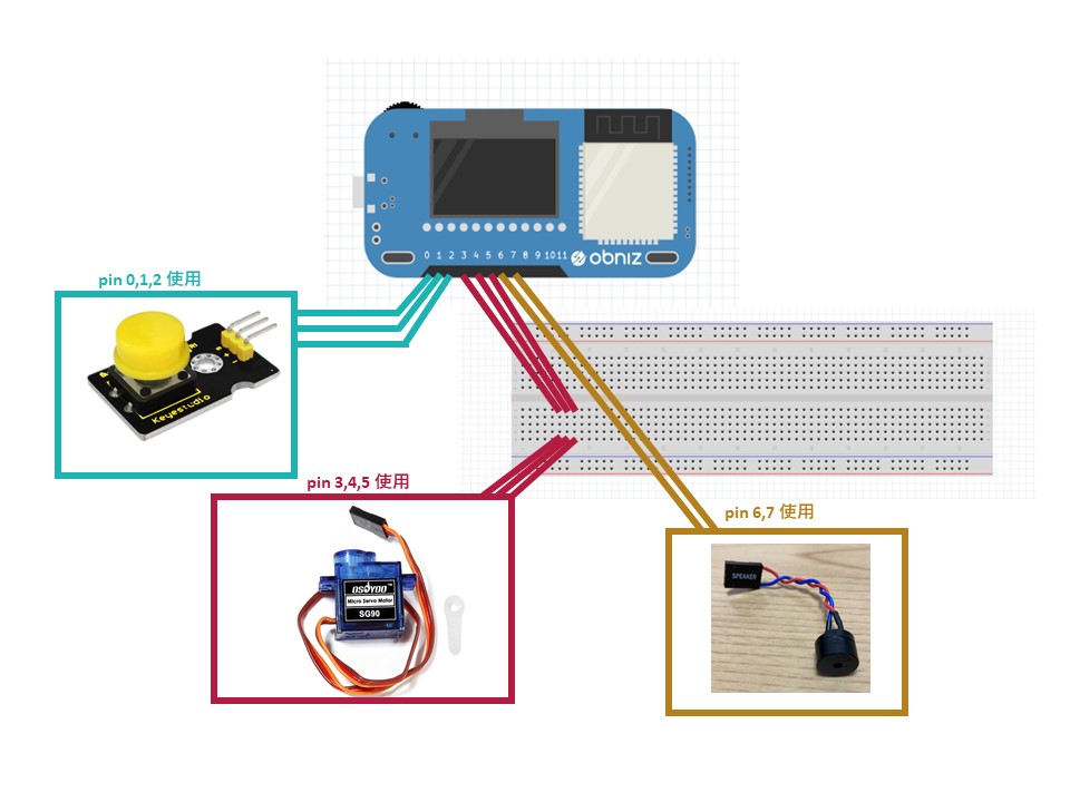 ・OSOYOO Micro Servo Motorを直にobnizに挿した場合、動かない→電圧が足りてないようで、ブレッドボード経由だと何故か動きました。調べると同様の解決をしている方がいました。