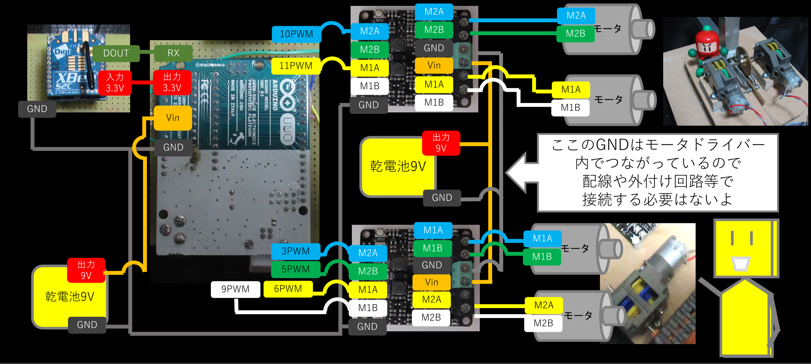 車体側では,GNDをモータドライバーとArduinoで共通にするようにしてください.
