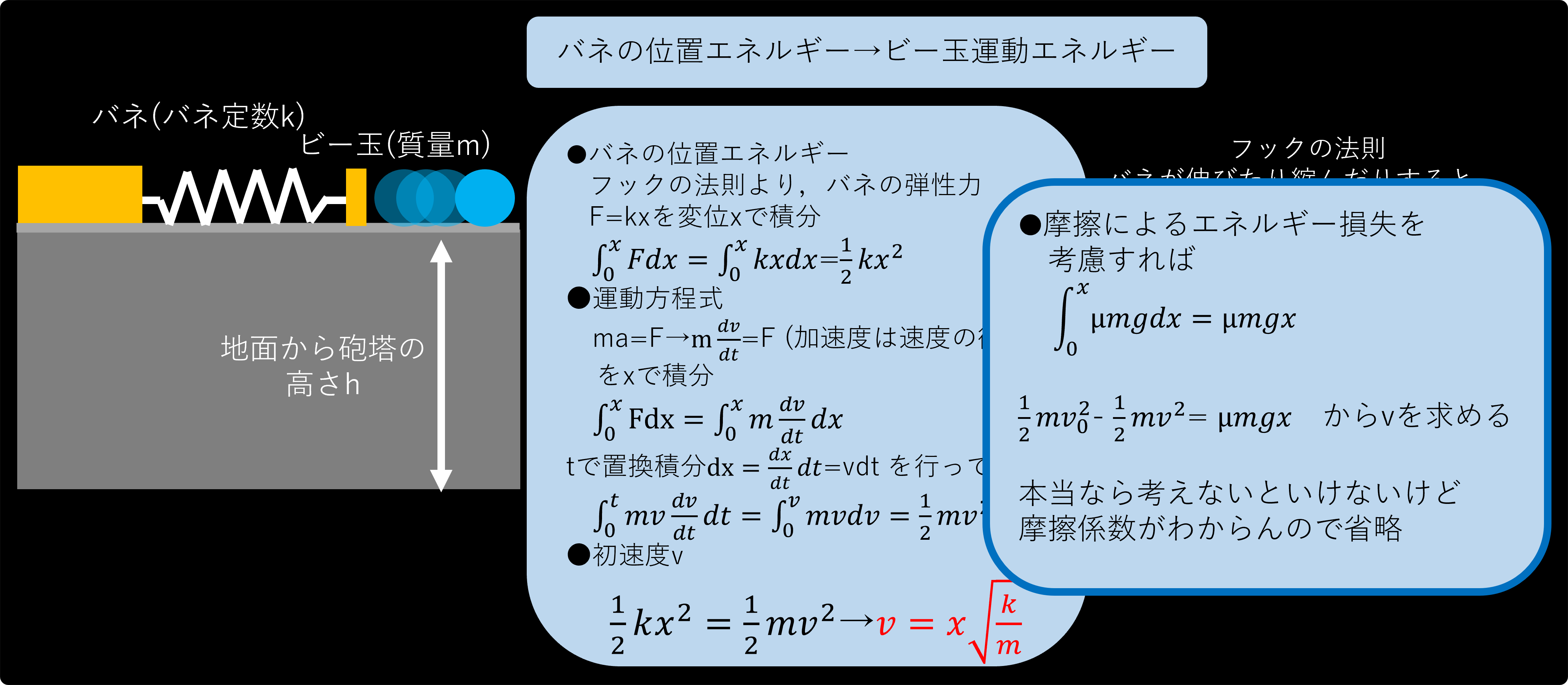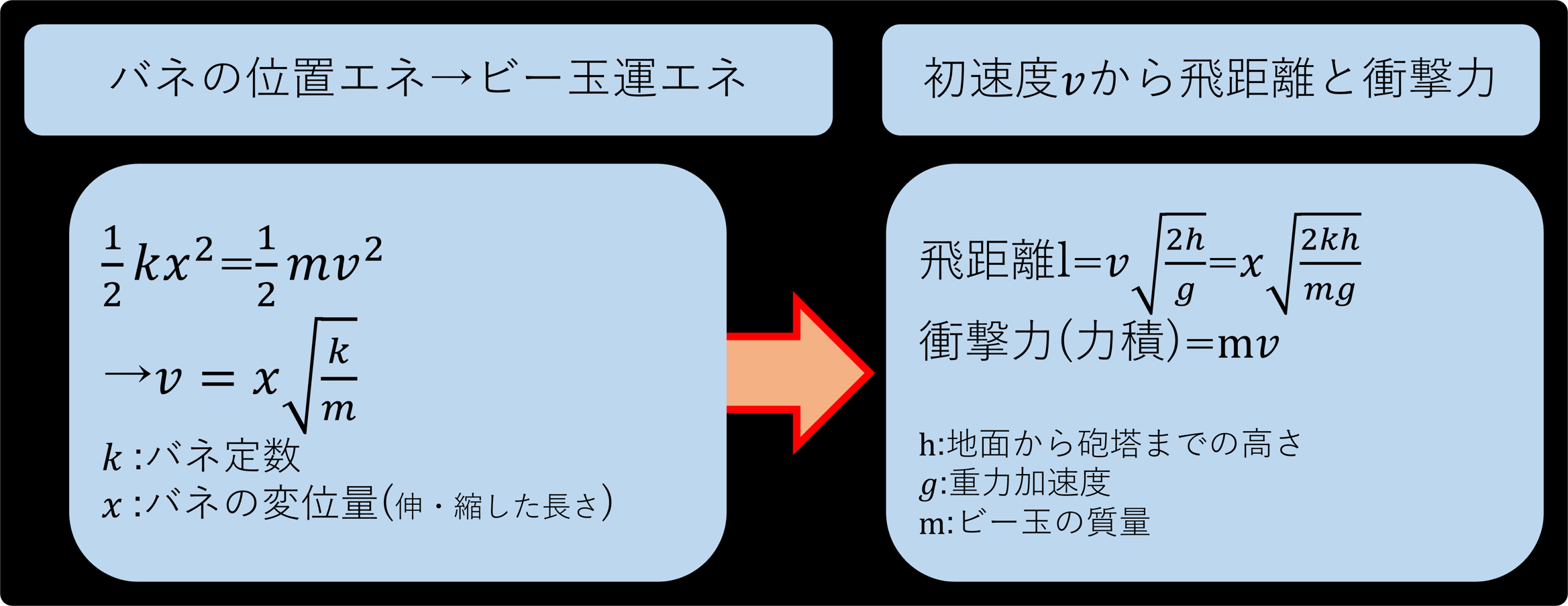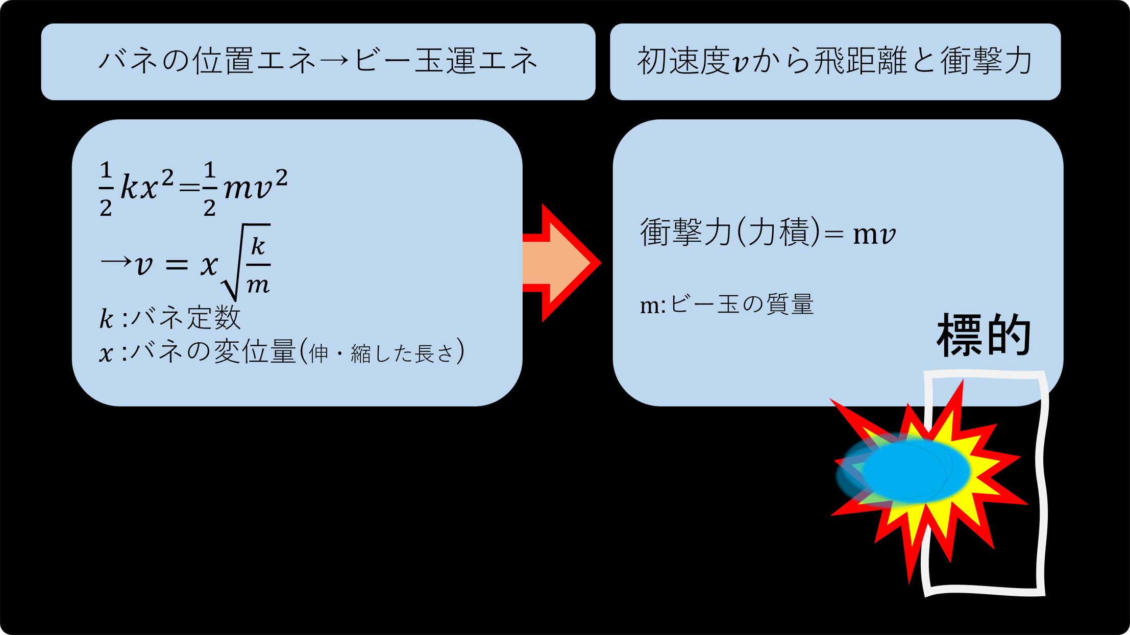 威力は,ビー玉の初速度と質力を掛けることで求められる力積,つまり衝撃力で求められます.