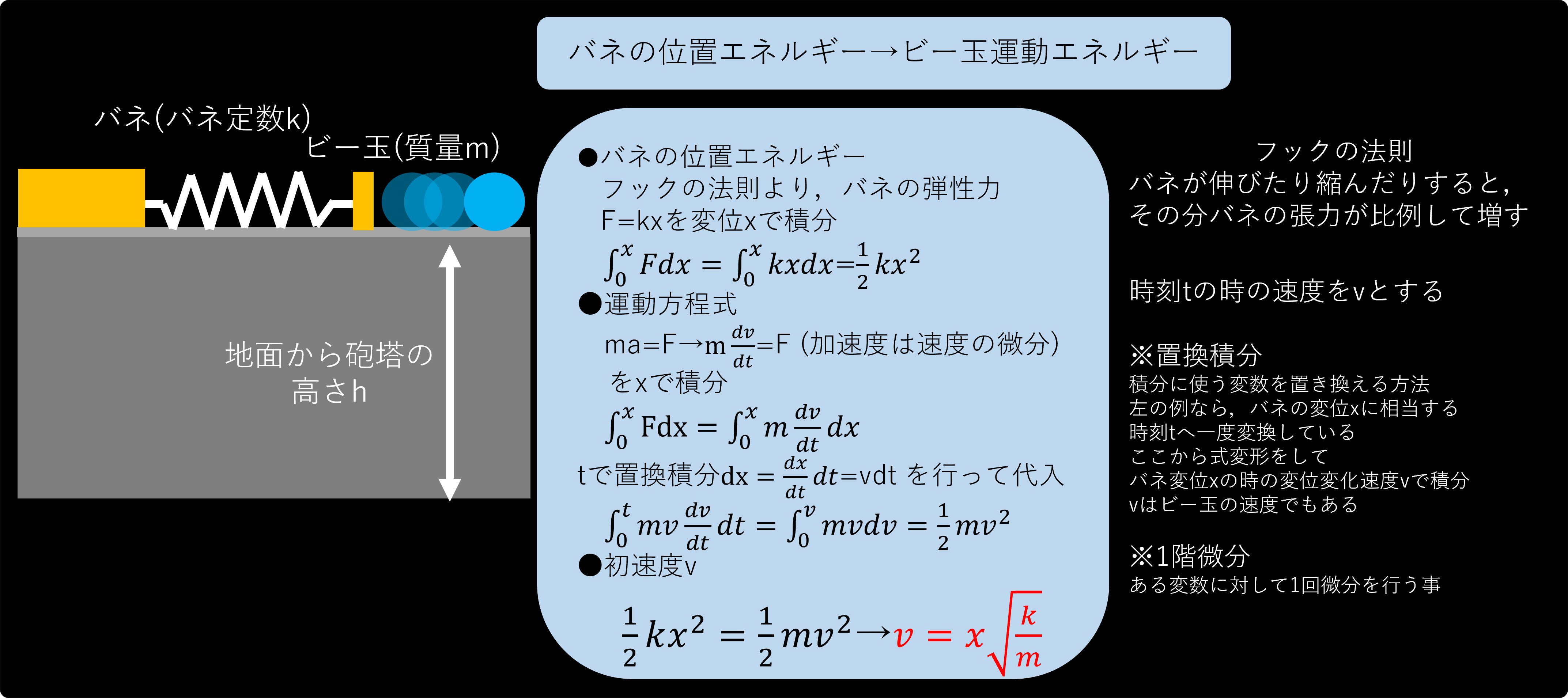 初速度は,バネが引っ張られた分,蓄えられた位置エネルギーが運動エネルギーに変換されると
