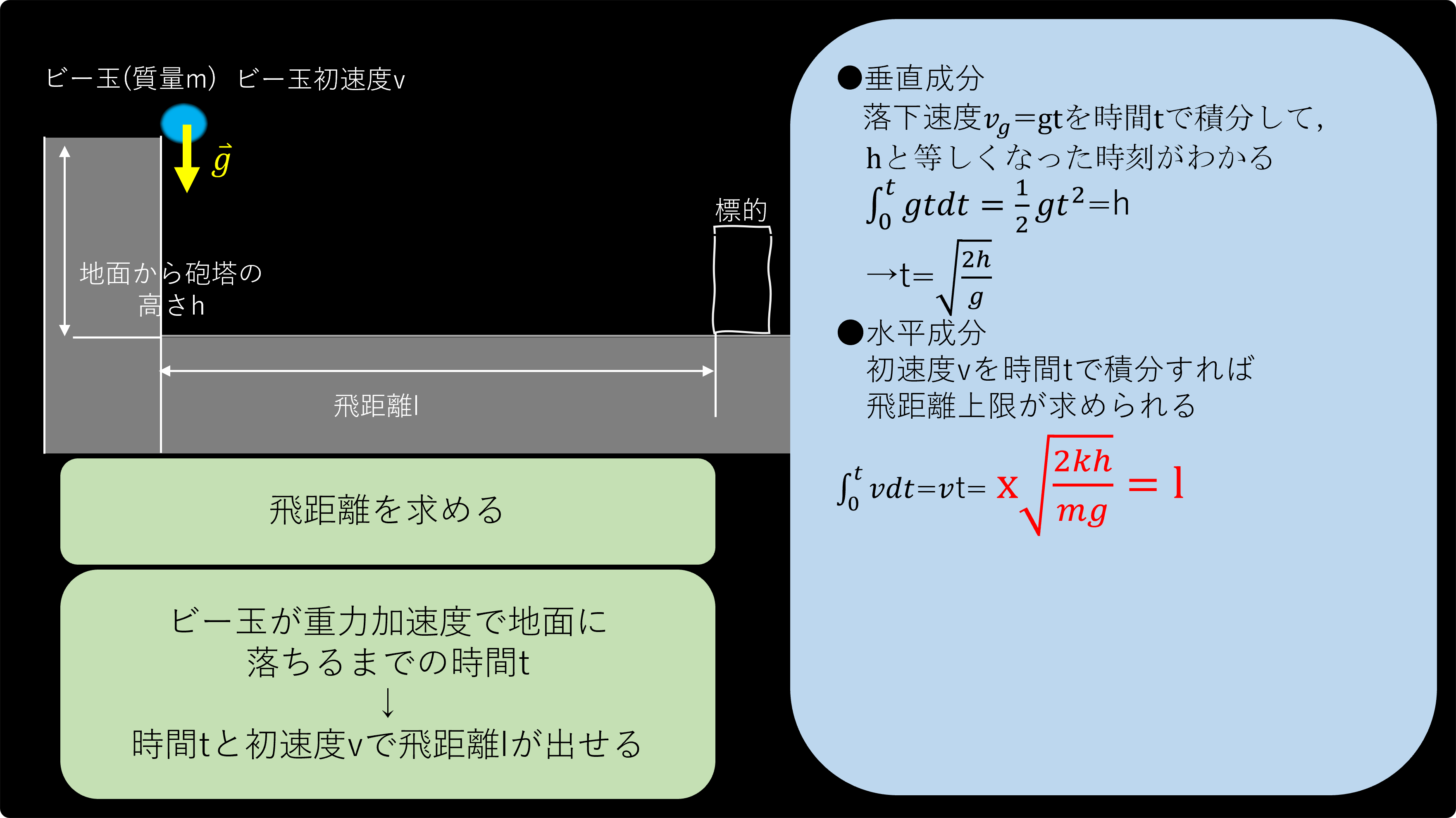 飛距離は,重力により,ビー玉が地面に落ちるまでの時間を初速度に掛ければ求められます.
