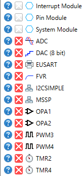 基本、モジュールをポチポチ追加していくだけでMCCがお膳立てしてくれる。ちなみにMSSPがI2Cを構成するモジュール本体で、I2CSIMPLEというのが面倒な割り込み処理やらステートマシンをすべて構成してくれる神機能である。各々の設定はそれほど難しくないので省略する。また、delayの実装とLCDの制御も省略する。