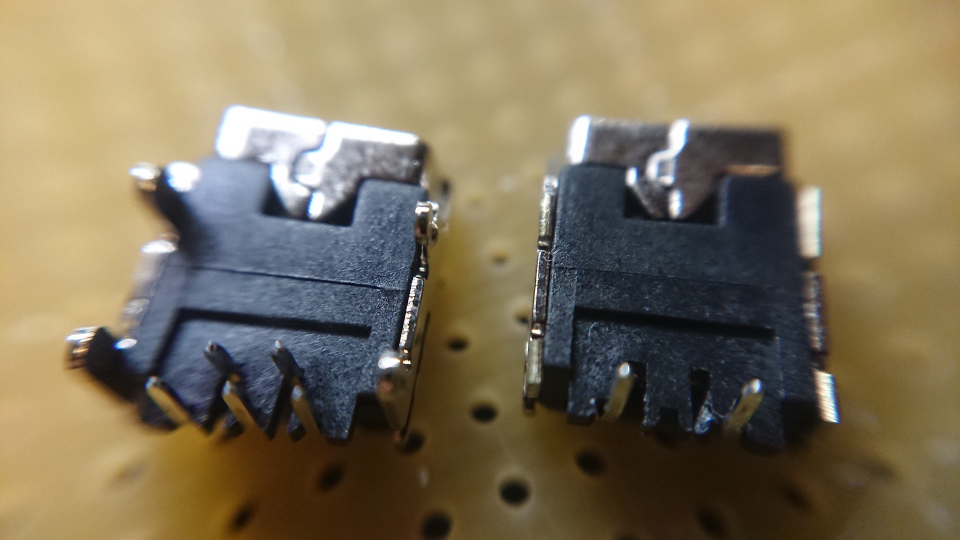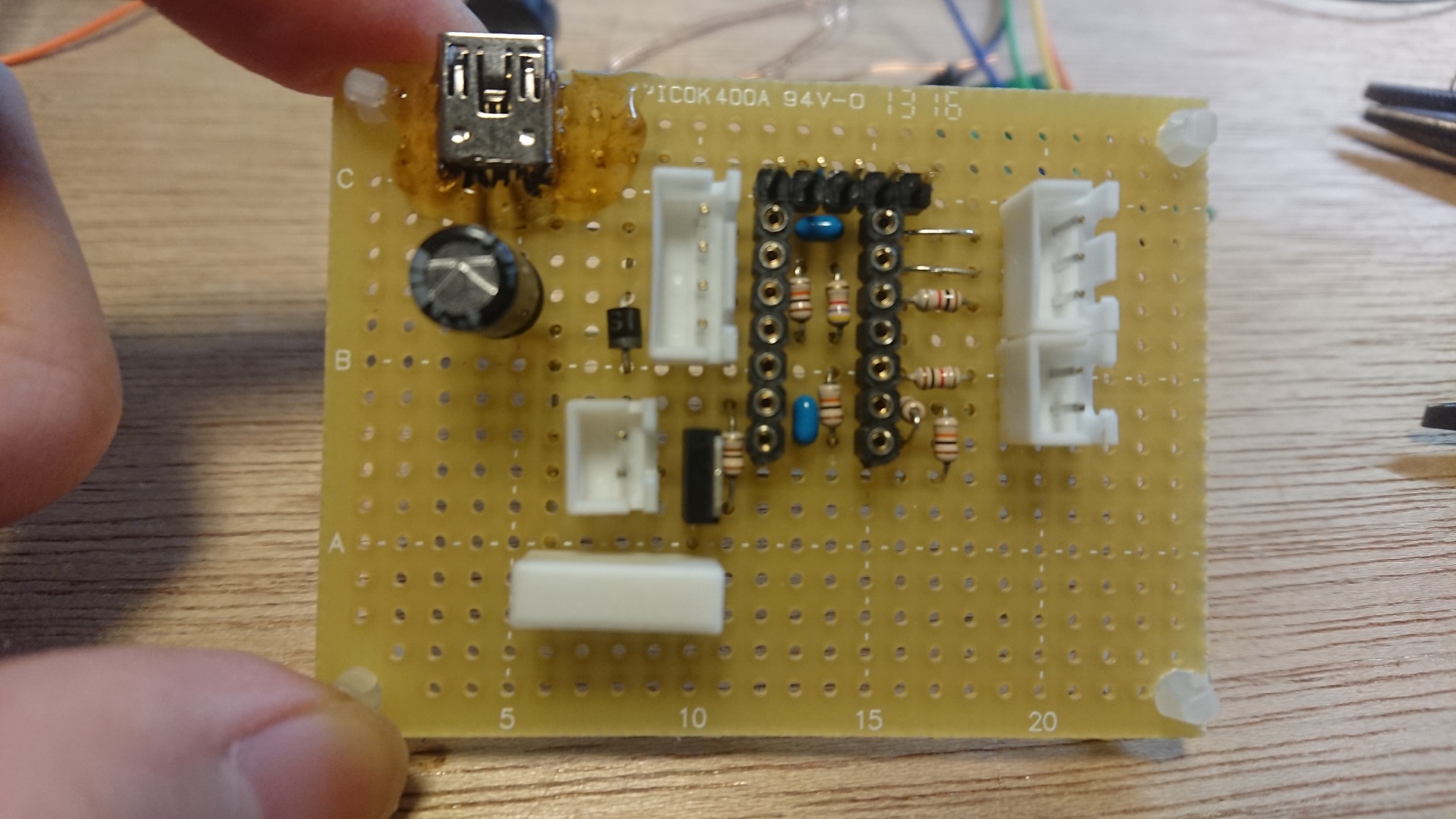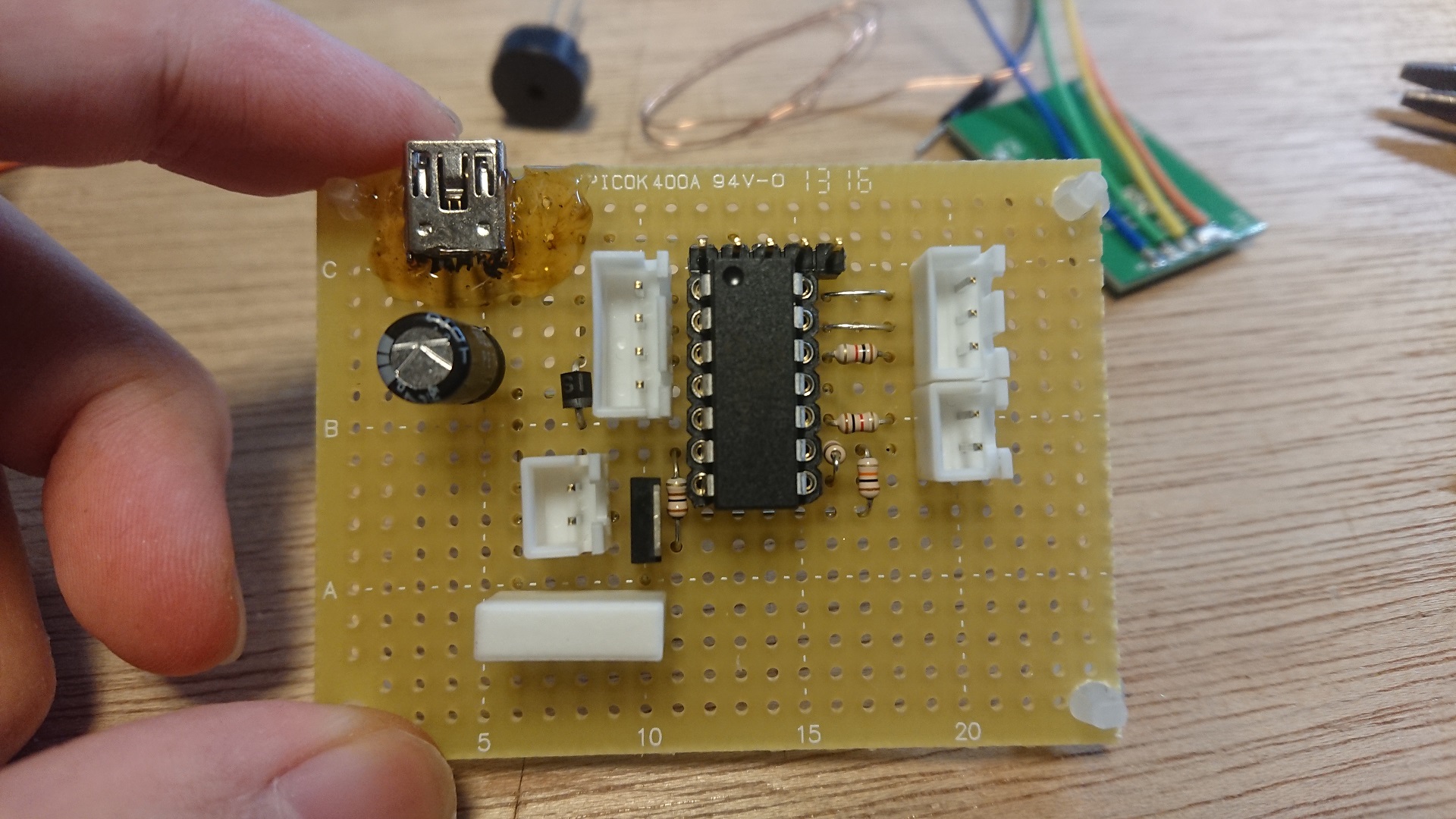 USBコネクタだが、そのままではユニバーサル基板に刺さらなかったので、電源ライン以外の足をもいでつけた。そのままだと強度的に心配だったので、ハックルーで補強している。