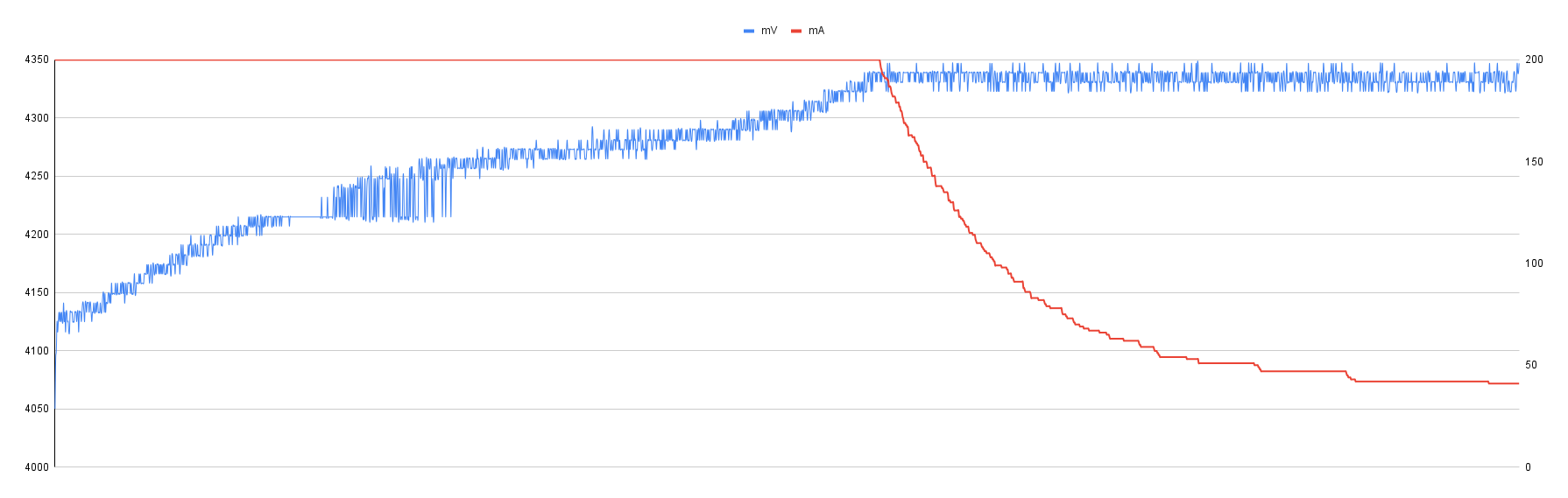 充電しながら電池の電圧を計っているので、実際には充電電流×内部抵抗[V]分だけ高く出ている。正確にやりたいなら計るときに一旦充電を止めれば良いが、CVモードでギリギリまで充電しようとしているのでこれで不足分は補えていると思っている。……これでいいのかは知らない。