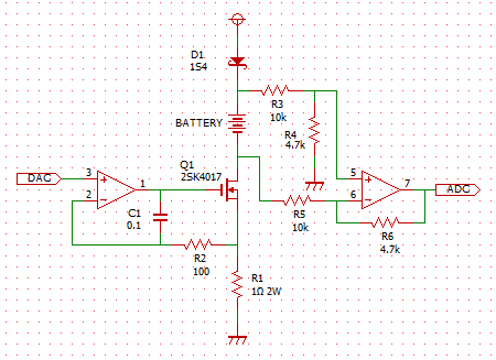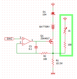 メインは教科書に出てくるような定電流回路(V-I変換回路といった方が適切かもしれない)の入力に、内蔵DACをつなげたものである。C1とR2は発振防止で、D1は電源未接続時に電池からの逆流防止でついている。