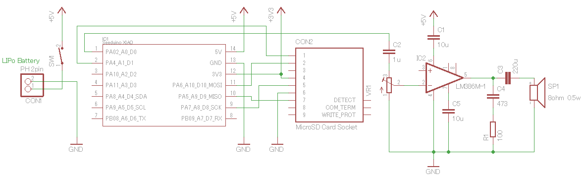 XIAO で PCMファイルを再生するものが探しきれなかったので、ファイルフォーマット解析の部分を含め全て再生部は全て自作しています。