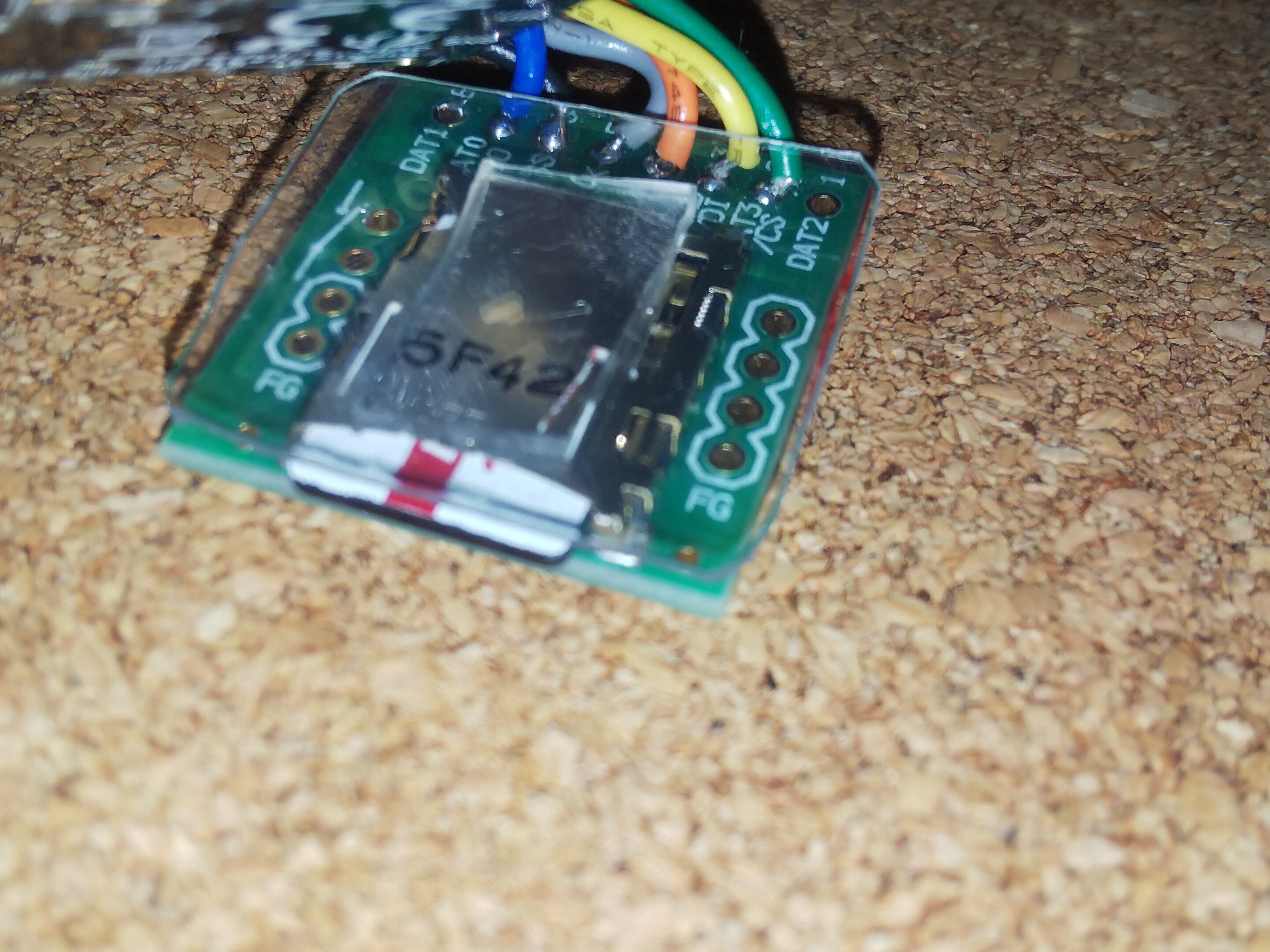 プラ板で土台を本体にホットボンドでつけて、土台に着けたスペーサーの間にマイクロSDソケットで挟み込んで、上から半円のプラ板で抑え込んでいます。