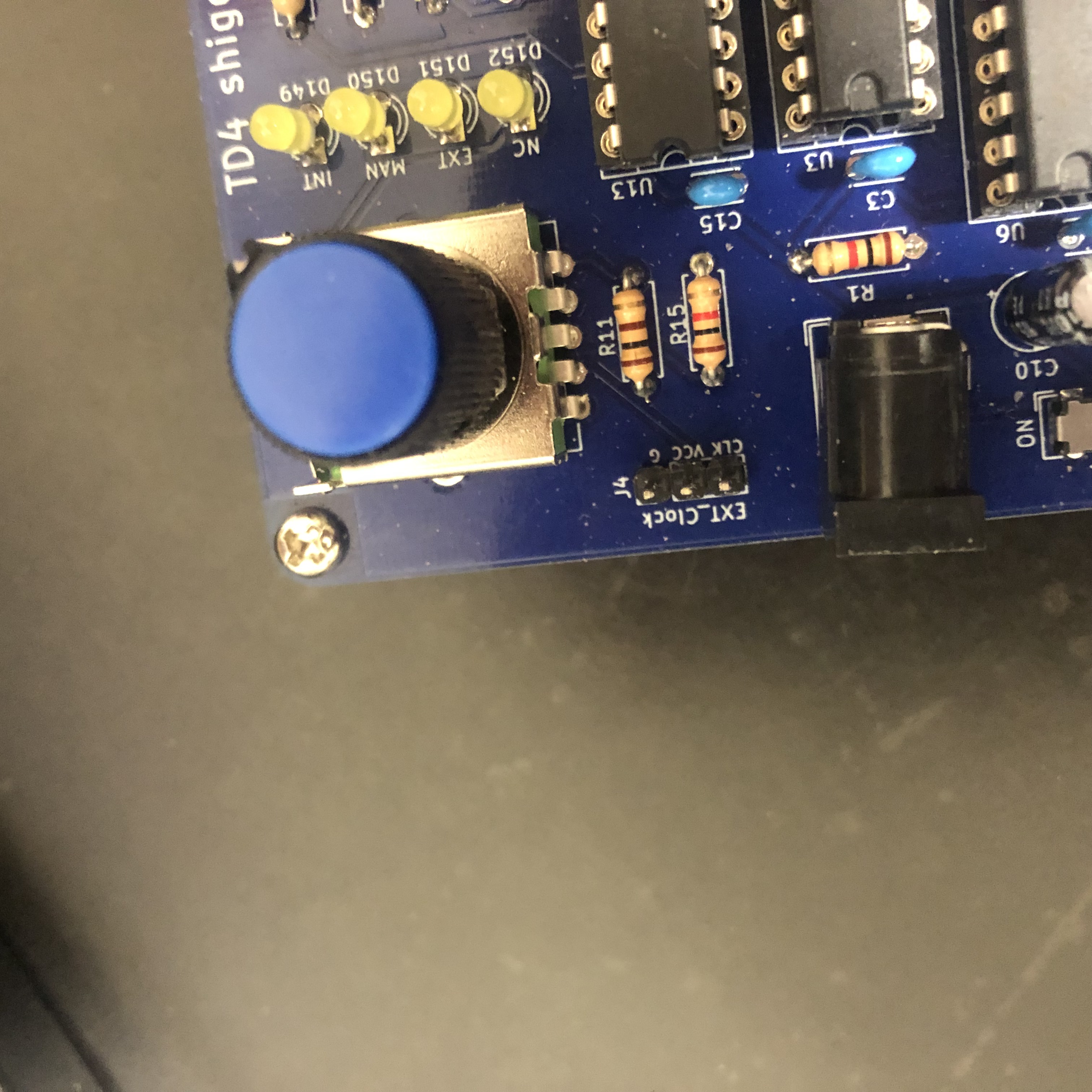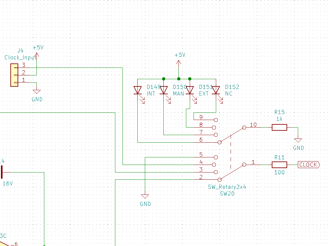 クロックソースを「内部・手動・外部」から選択することになるので、切り替えをロータリースイッチにしました。使用したロータリースイッチが2回路4接点だったので、1回路を選択中のクロックソースを示すLEDに使用しました。