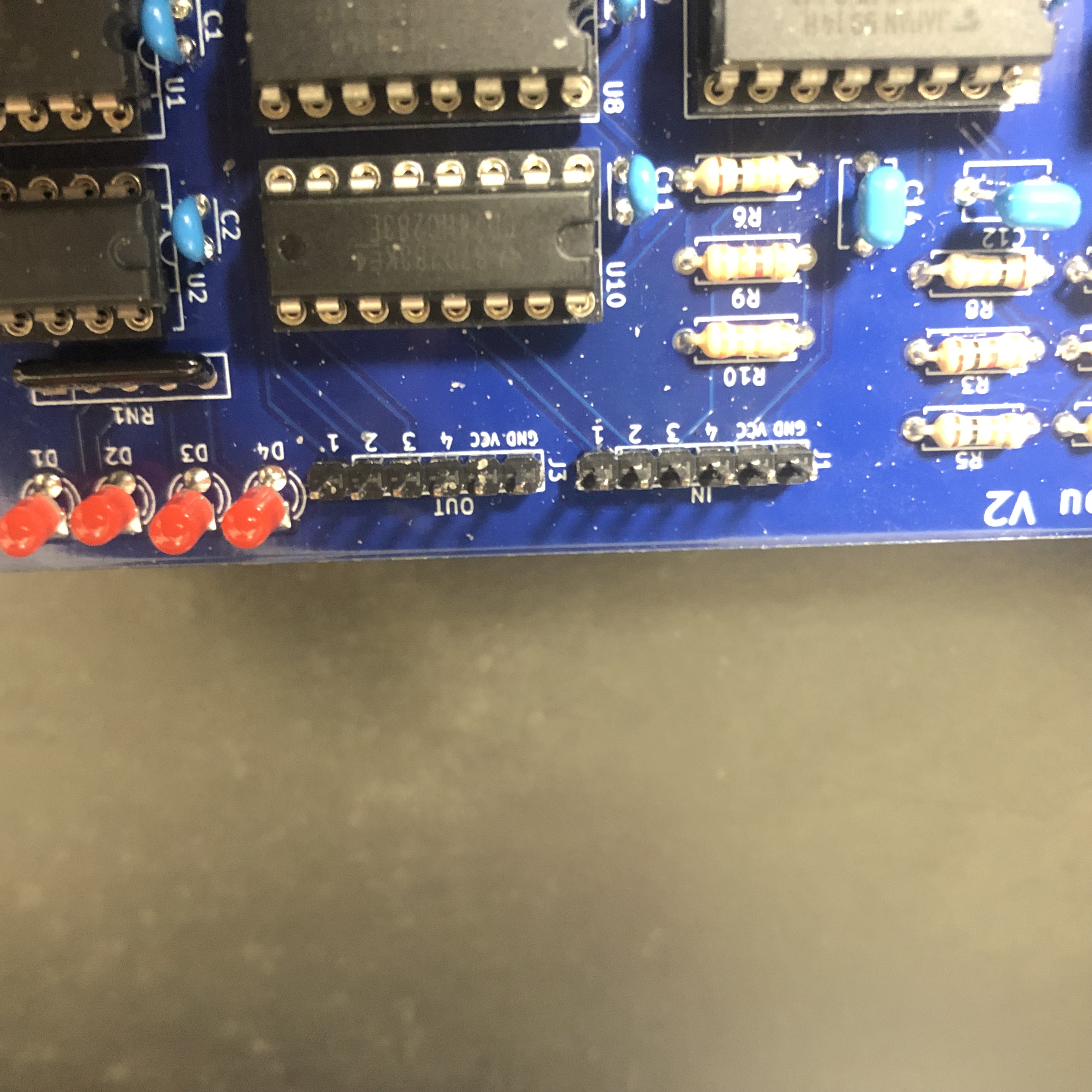 入出力にはピンヘッダを取り付け、他基板と連携できるようにしました。また、他基板へ電源を供給できるように、それぞれのピンにVCC・グランドピンを追加し、6ピンとしました。