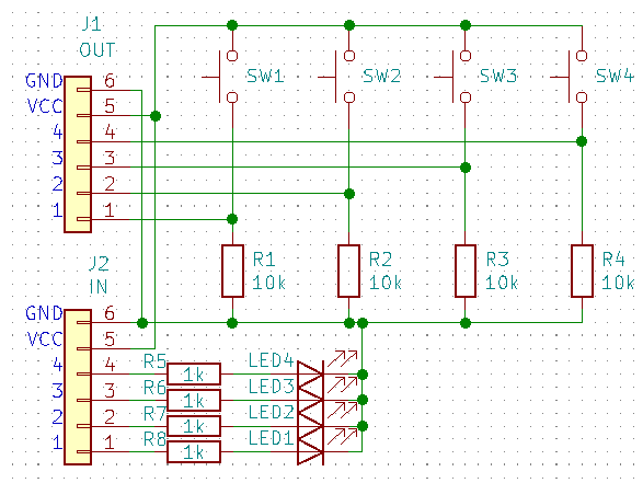 各出力ピンにはLEDをつなげ、どのボタンが押されたかを表示します。