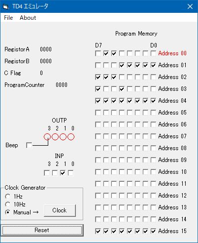 まず、Bレジスタへ入力端子の状態を取り込みます。入力端子には、プルダウンした押しボタンスイッチを接続するので、ボタンを押すと1が入力されます。次に、BレジスタをAレジスタへ転送(コピー)します。転送したAレジスタへ1111(2進数)を加算します。Aレジスタが0以外の場合(入力が有る場合)キャリーが発生するので、入力があったかどうかの判定ができます。キャリーフラグが無い(入力が無い)場合は、アドレス0へ戻り、入力取り込みへ戻ります。キャリーフラグが有る場合は、Bレジスタの内容を出力し終了します。