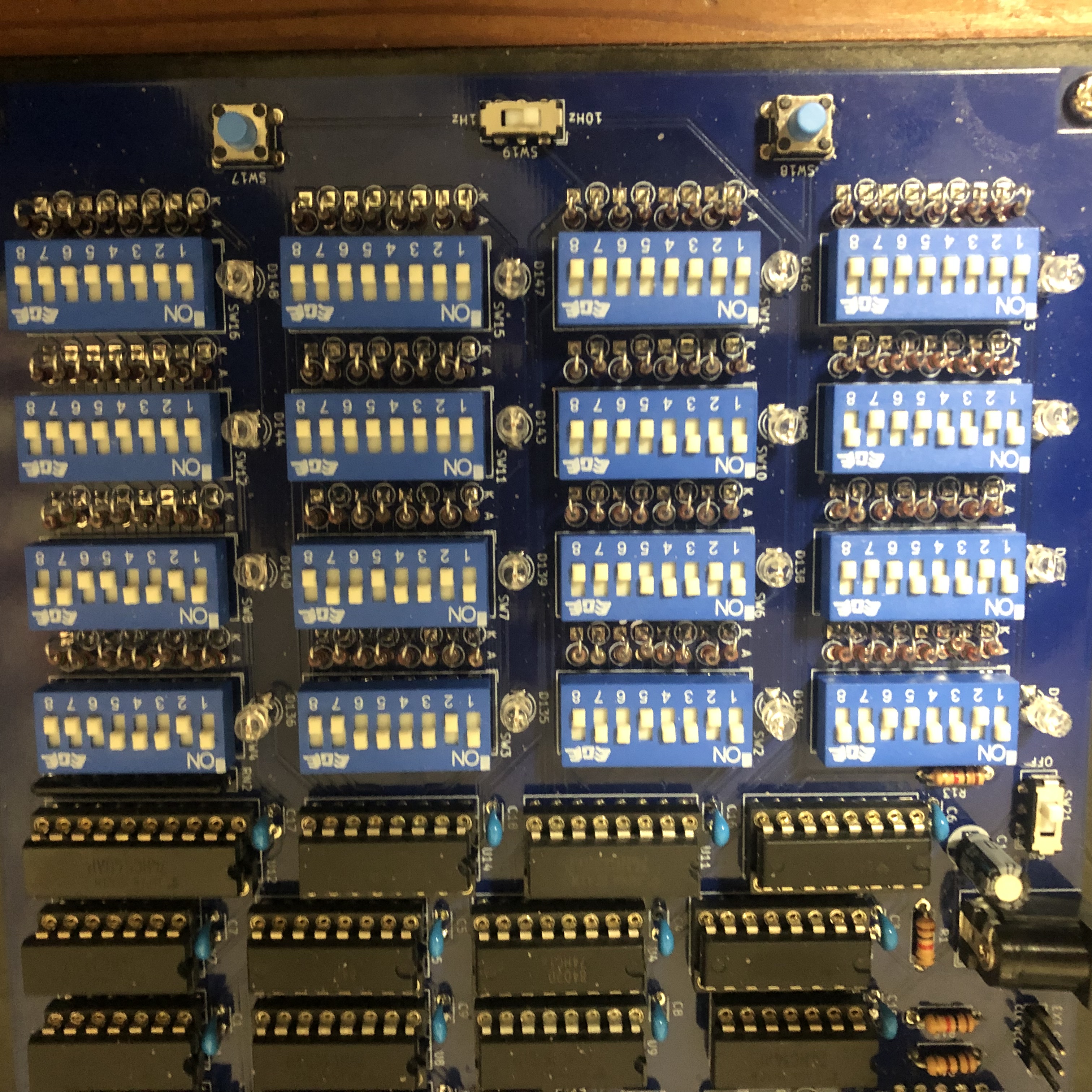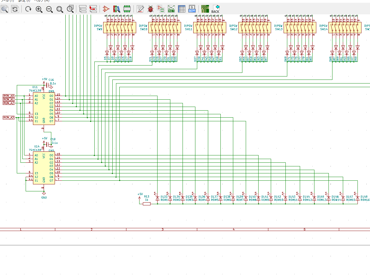 もとの回路図に無いLEDとしては、実行中メモリ位置確認用LEDをメモリであるDIPスイッチの横に設置しました。選択中のクロックソースを示すLEDも搭載しました。これは、4つある内の1つしか点灯しないので、1つの抵抗につないでいます。