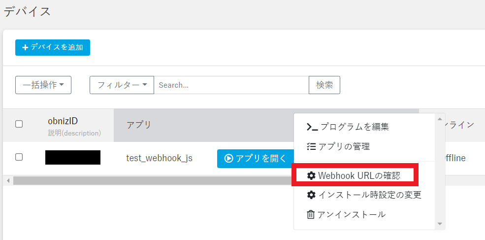 デバイス画面で「Webhook URLの確認」をクリックします。