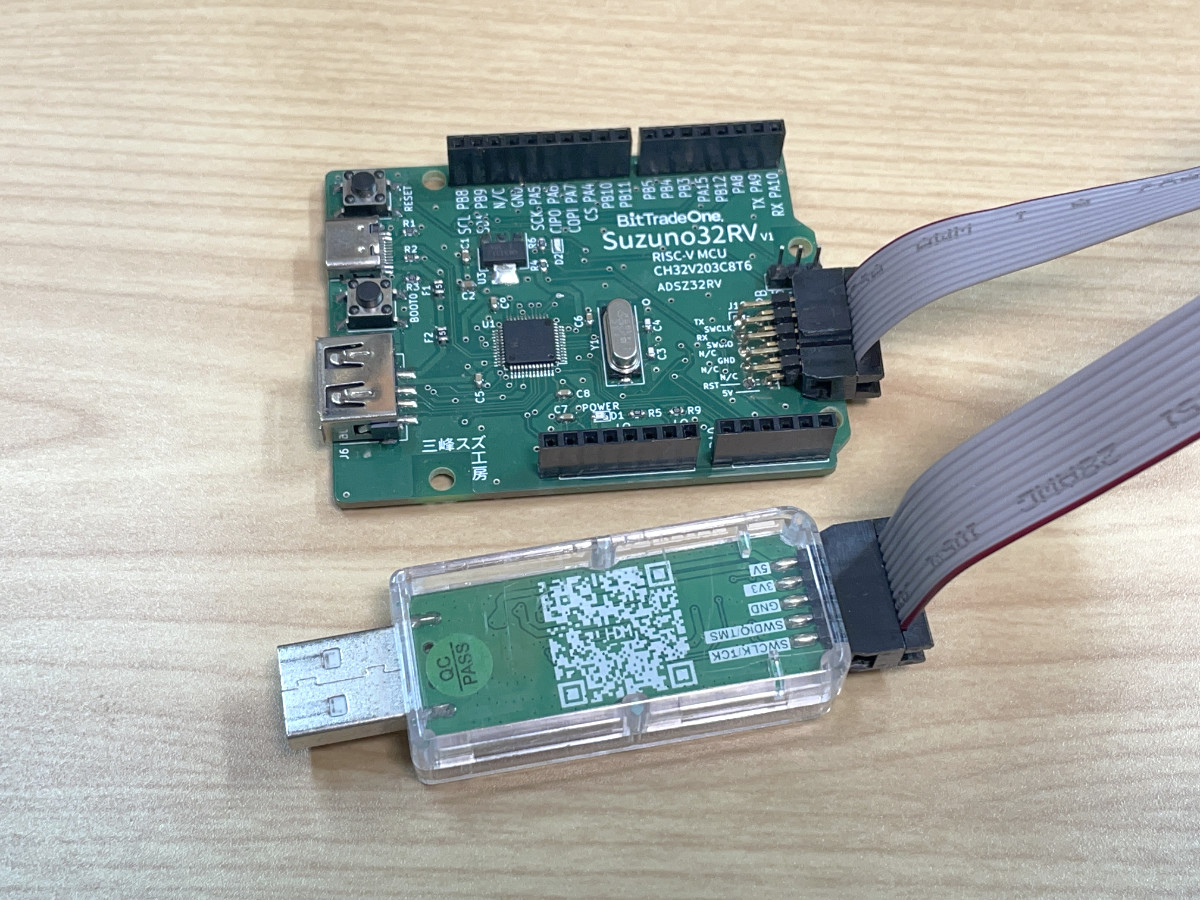 デバッグ機能には公式デバッガーWCH LinkEでの接続が必須です。(Suzuno32RVボードからType-Cコネクタ経由でのUSB接続ではできません)