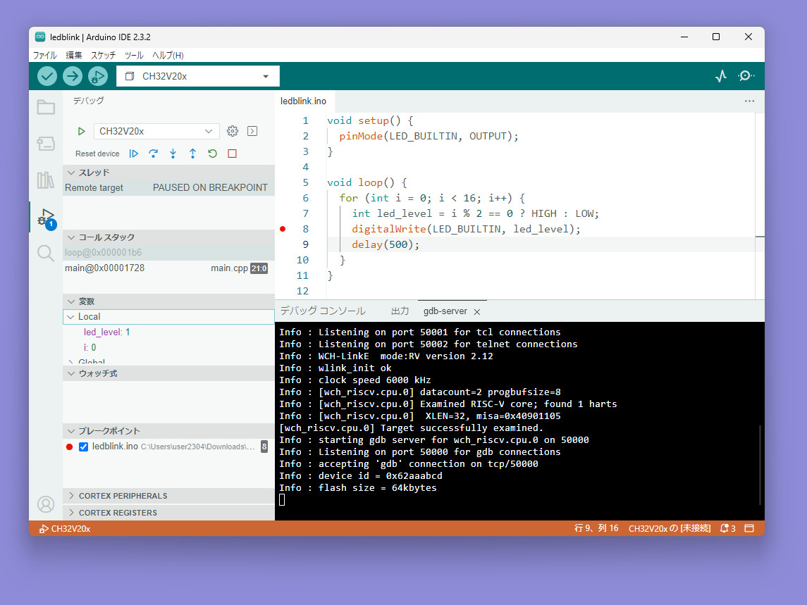 CH32VにはWCH自身によりopenocdが移植されていて、これをArduino IDEから呼び出すことでGUIからブレイクポイントを設定したり変数の値を確認したりできます。