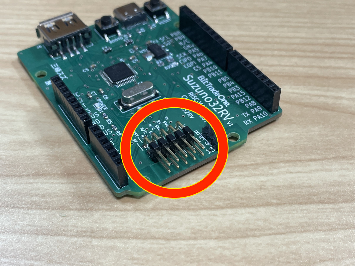 Suzuno32RVではWCH LinkEが接続できるピンヘッダーのパターンを用意していますので、ここにL字の10ピンのものをはんだづけしてください。
