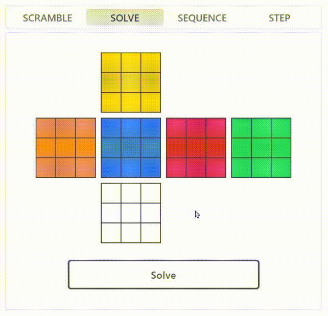 ルービックキューブの崩れた状態をWeb UIから入力し、Solveボタンを押すと自動で揃え始めます。