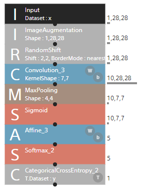 Sony Neural Network Consoleを用いて実装。取得画像を28x28のグレースケール画像に圧縮。