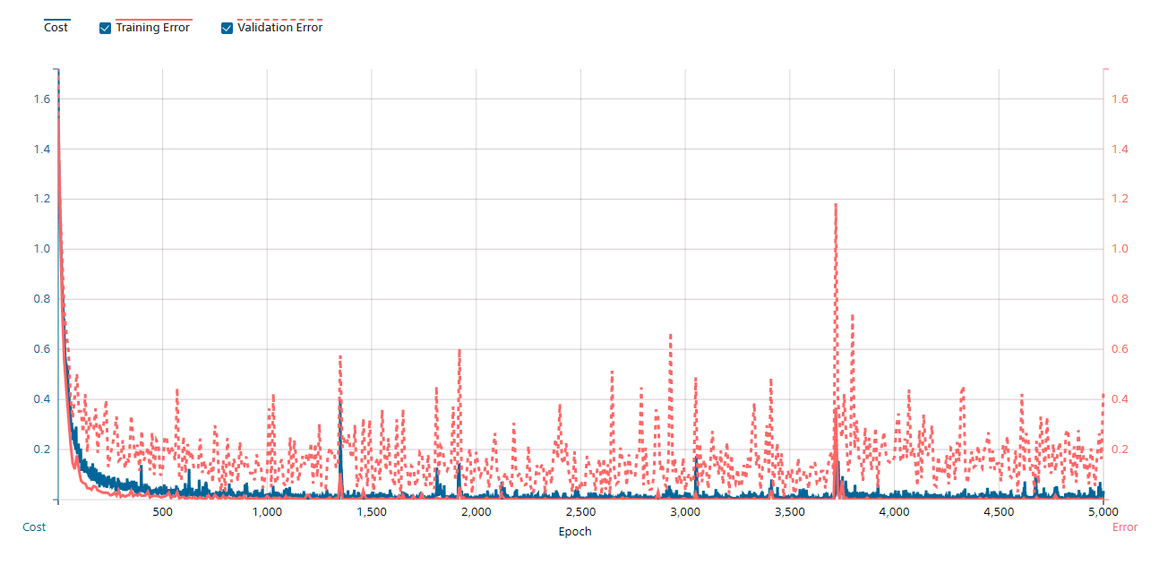 デフォルトはEpoch数が10回だったので、認識率が低かったものの、徐々に増やして試してみて、5,000回に設定。最終的には98.28%に到達。
