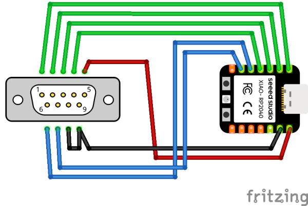 D-sub 9ピン オスコネクタの 1~4番ピン(スティック)をD0~D3に、6~7番ピン(ボタン)をD4~D5に接続します。また、5番ピンを5Vに、8番ピンと9番ピンをGNDに接続します。