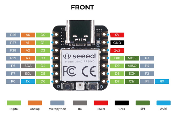 ピン番号の指定は 0, 1, 2... と書けば D0, D1, D2, ... を意味するのかと思いきや、それだと P0, P1, P2, ... を意味することになります。D0, D1, D2, ... と書いたほうがピン配置が分かりやすいでしょう。ピン配置は下図の通りです。(メーカーの販売ページより)