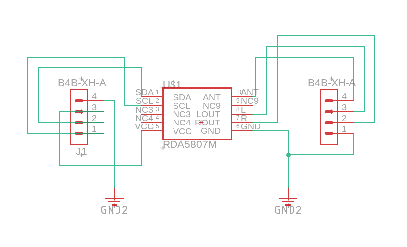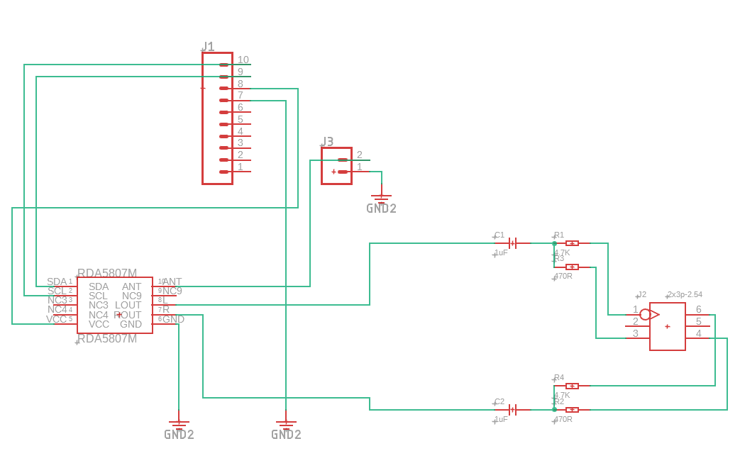 mic入力基板の設計についてRDA5807(DSP)からの出力信号はイヤホンを駆動できるレベル(約 )があるため、spresenseのアナログ入力(マイク入力)にそのまま接続すると音が割れてしまいます。そこで、分圧回路を通して適切なレベルまで減衰させています。今回、汎用性も考慮して以下の定数で回路を構成しました。