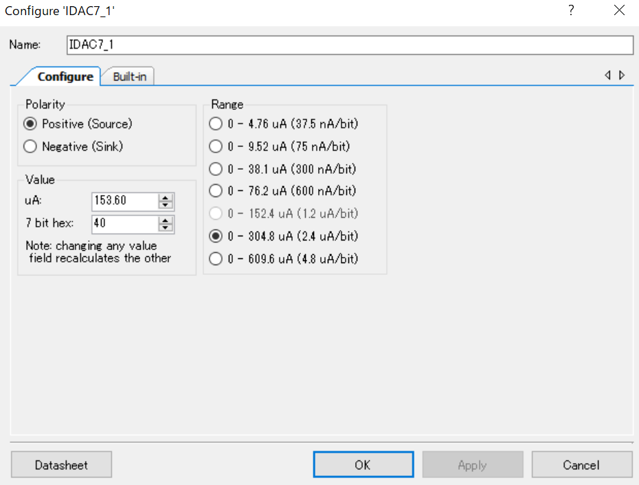 μAを変更するか7bit hexを変更すれば電流値を変化させることができます。片方を変化させると他方は自動で計算されます。