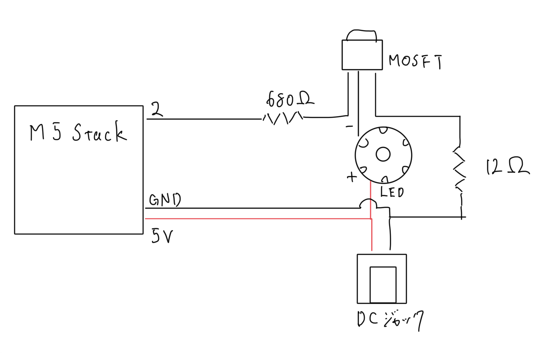 回路はさっきと同じです。M5Stackに取り付けられるようピンヘッダを付けました。