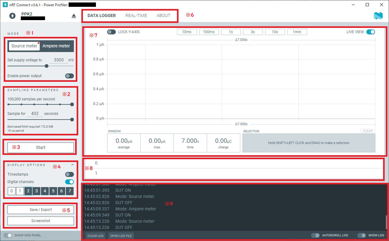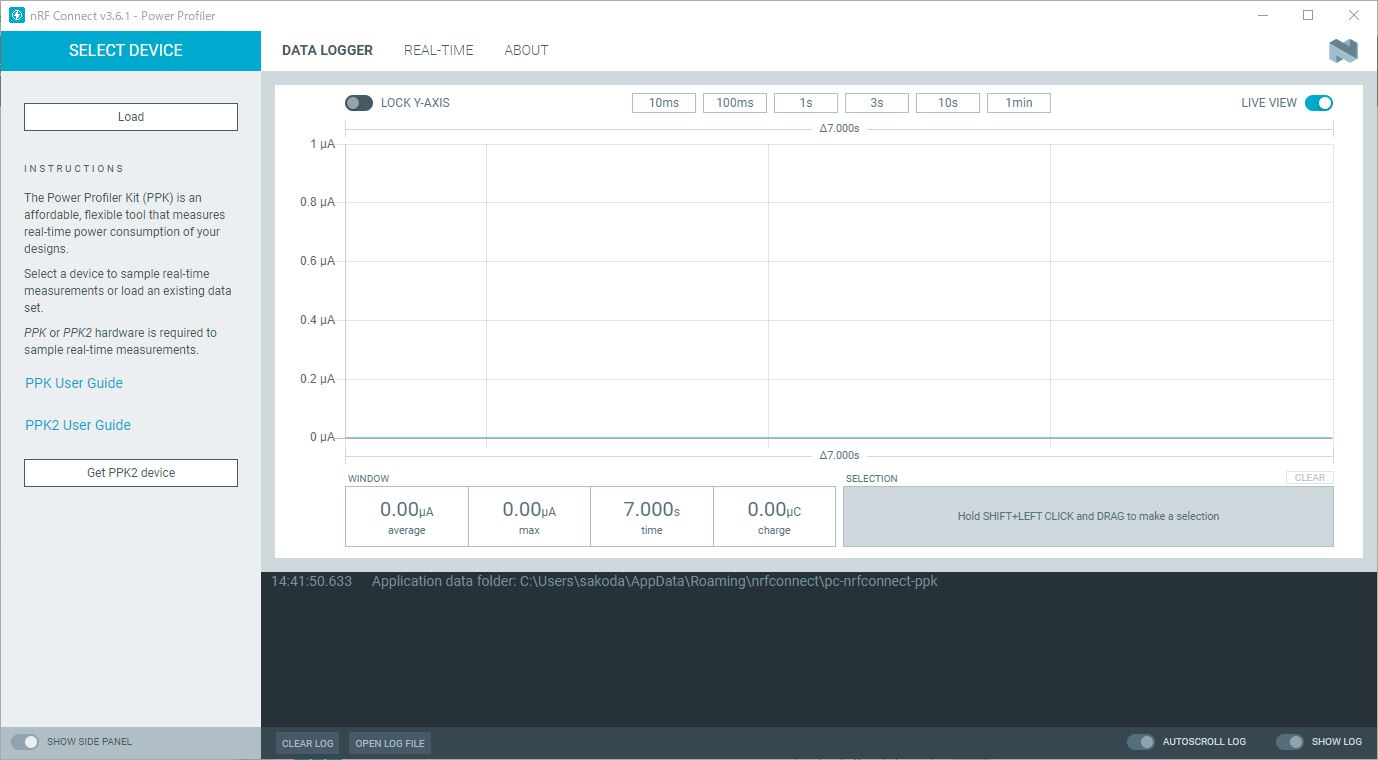 ここでPPK2をPCに接続すると左上SELECT DEVICEから選べるようになります。