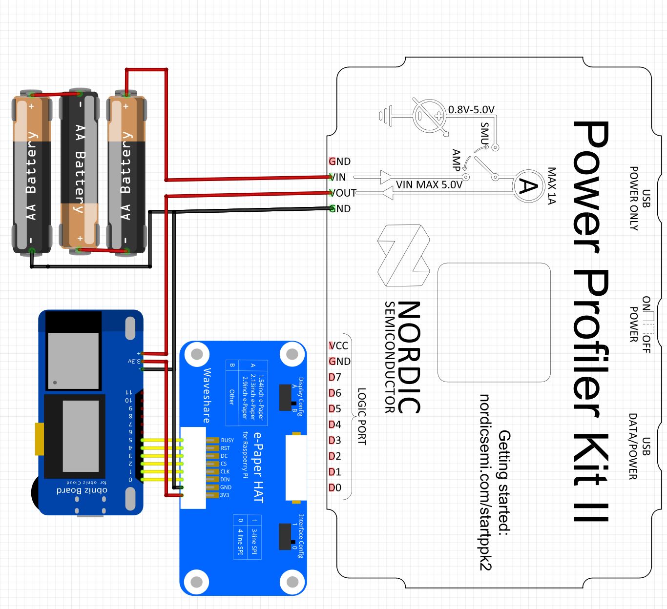 測定するにあたって、今回はPPK2の電流計モードを使用して計測することとし、以下の通り配線しました。