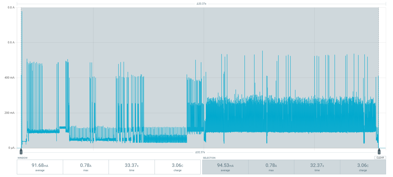 起動直後約30秒間消費電流が激しく変化した後、sleepに入っている様子が確認できると思います。