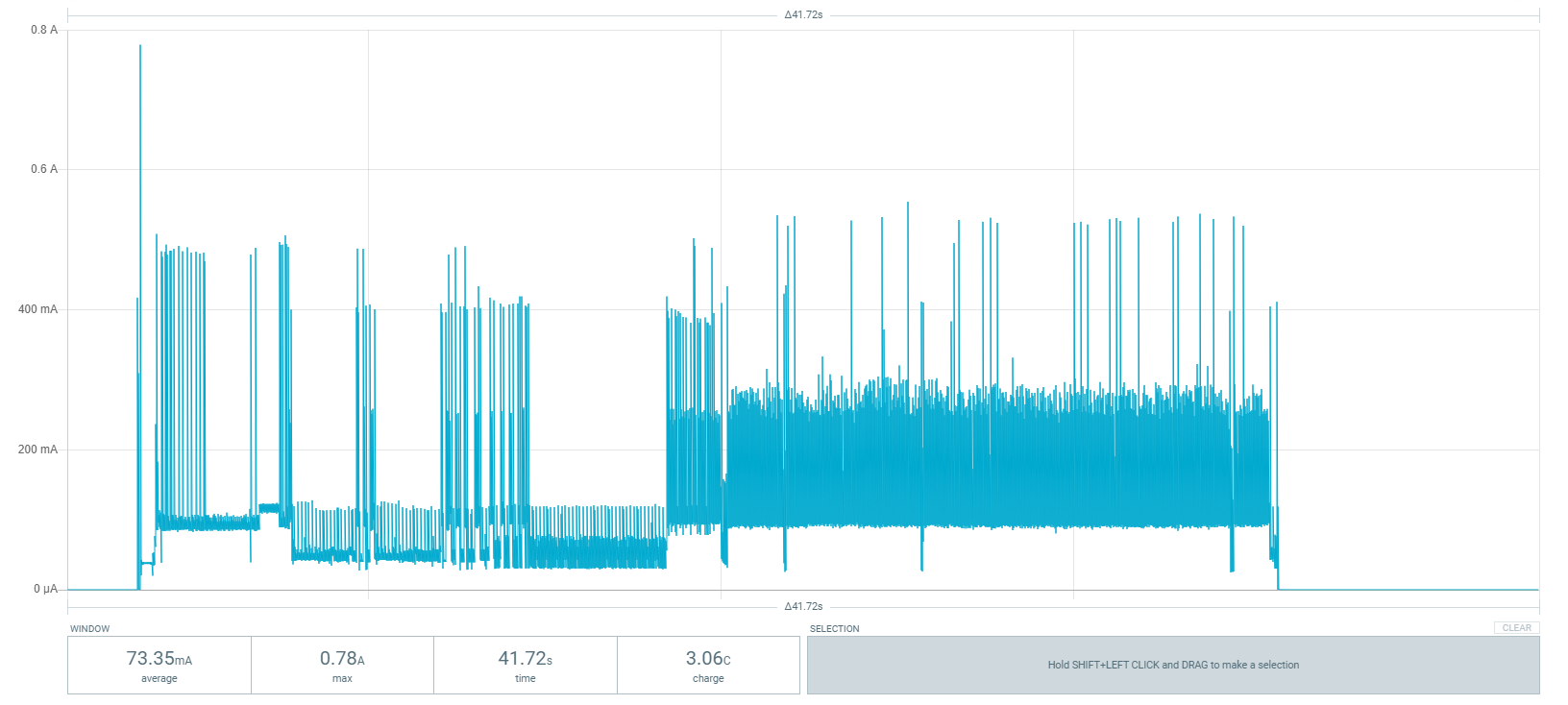 起動直後約30秒間消費電流が激しく変化した後、sleepに入っている様子が確認できると思います。
