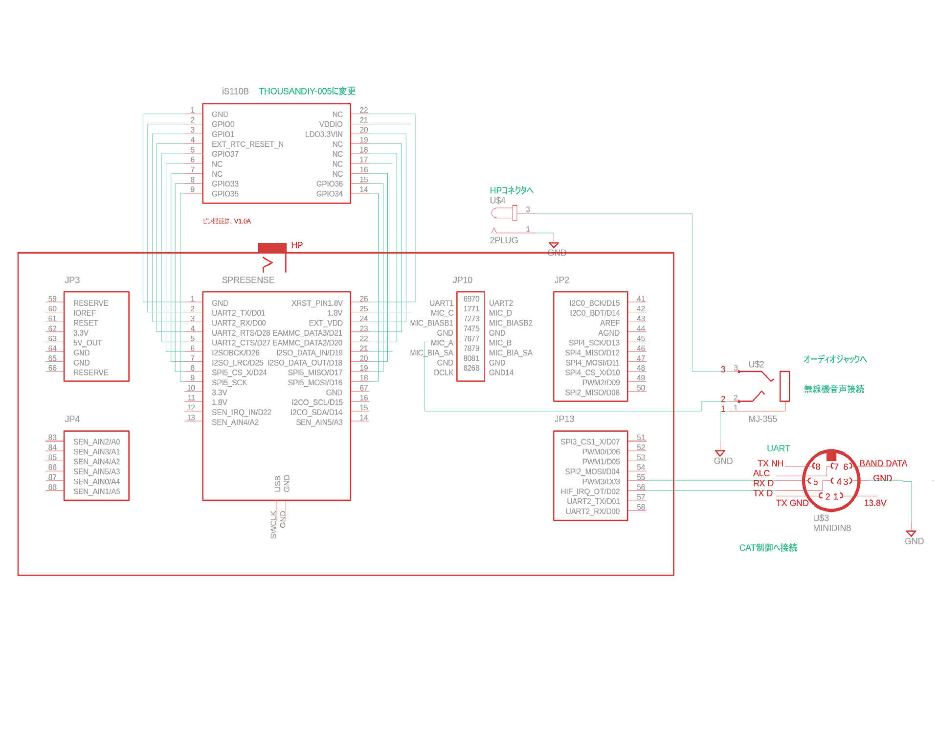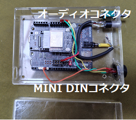 蓋をあけた時の写真を以下に示します。拡張ボードにメインボードが接続され、メインボードにWiFi add-onボードが載っています。拡張ボードのピンソケットに外部から接続するオーディオジャックとMINI DINコネクタが接続されています。