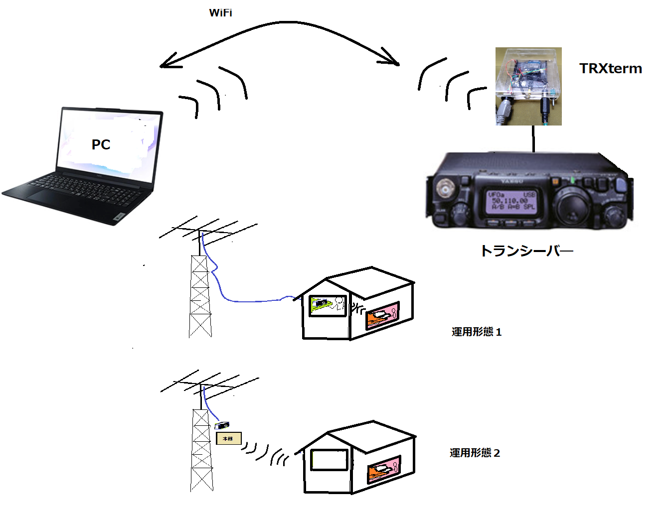 以下の図のようにアマチュア無線のトランシーバに接続されたTRXtermは、WiFiでPCと接続され、PCから遠隔でトランシーバを操作します。これにより、以下の2通りの運用が可能になります。