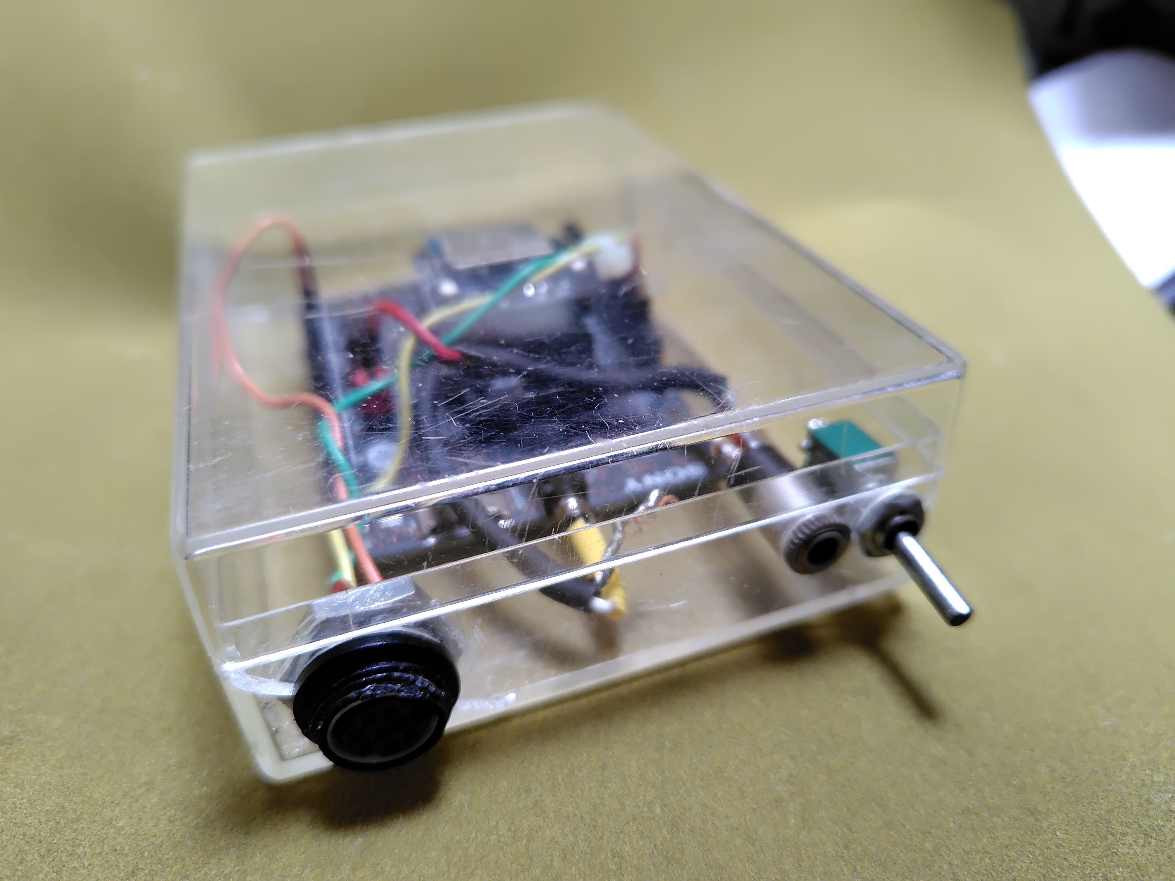 SPRESENSEメインボードと拡張ボードの構成にWiFi基板を実装し、音声ジャックとCAT用端子を追加してケースに入れました。電子工作としては、おこがましいのですが、ジャックとコネクタへのはんだ付けとケース収容が中心です。